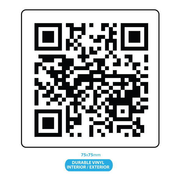 Self-Adhesive QR (Quick Response) 2D Barcode Labels printed black on gloss white permanent vinyl & over-laminated for additional durability. Labels measure 75x75mm & are supplied in packs of 100. This code will be encrypted with your website / contact / v-card details to be supplied by you at the time of ordering in the personalisation field provided. This Code, when scanned by QR Reader software on Smart Devices, will display your website or specific web page or v-card details. Ideal for affixing to your Products, Goods, Tools, etc.