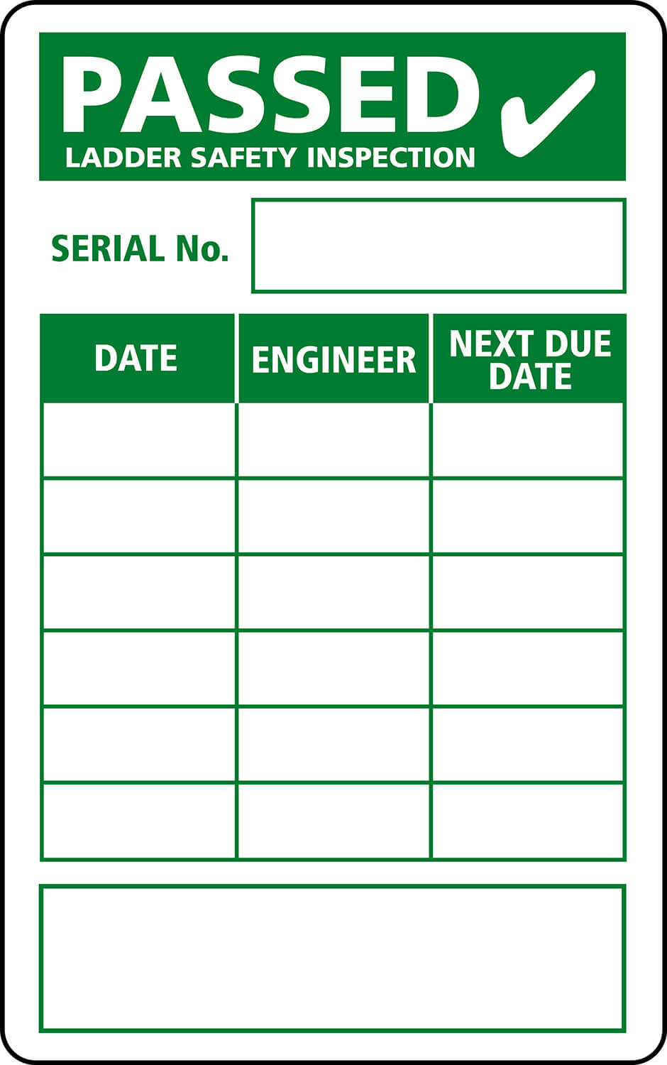 Self-Adhesive Ladder Safety Inspection Record Labels printed green and black on high quality, non-rip matt white permanent vinyl. Ladder Safety Inspection Labels are 100% waterproof and can be easily written on with most pens. Supplied in handy resealable packs of 50 labels, our Ladder Inspection labels measure 50x80mm for positioning on the side of any set of ladders and are printed with your company details. Please complete required personalisation provided. To achieve best adhesion please apply to a smooth, clean and flat section of ladder.