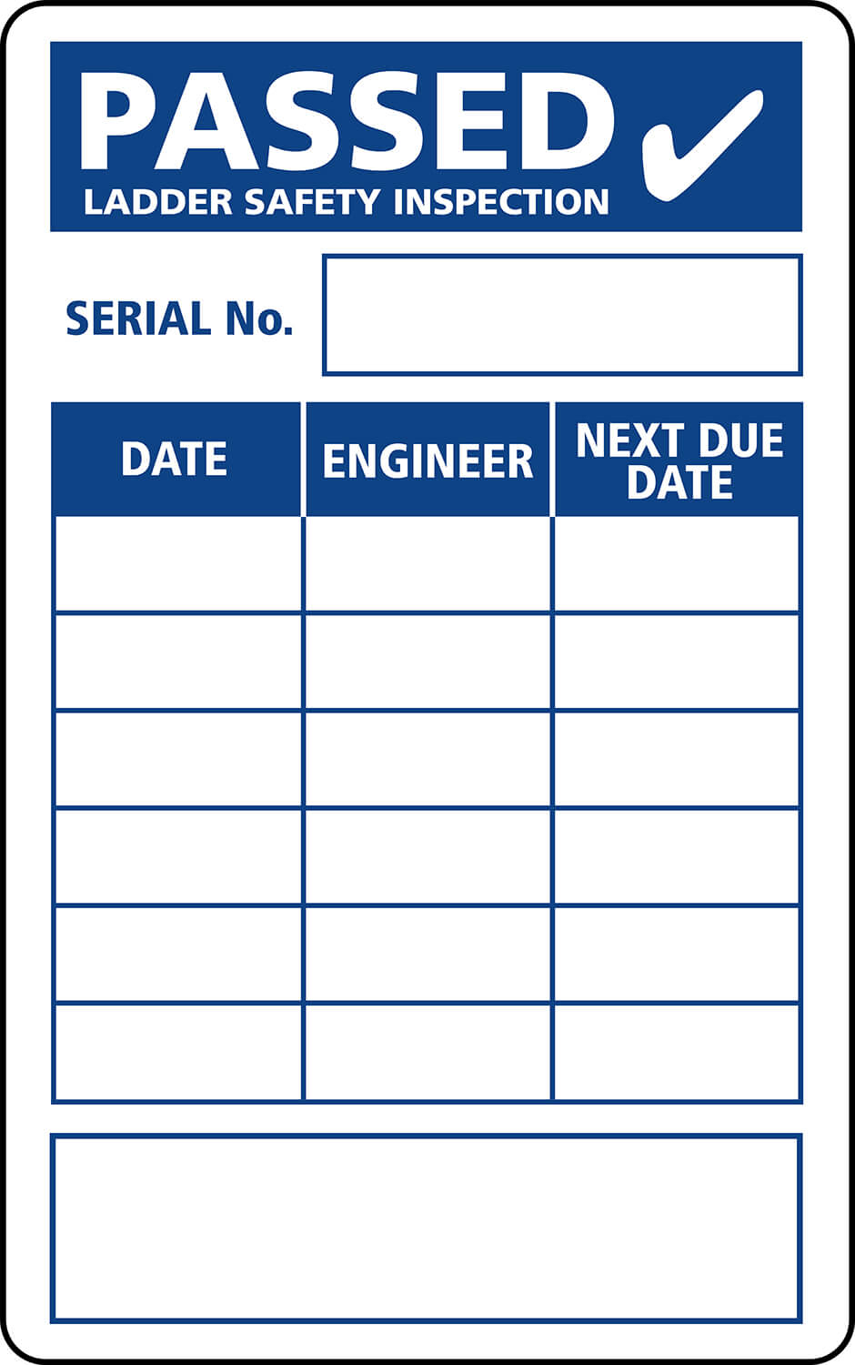 Self-Adhesive Ladder Safety Inspection Record Labels printed blue and black on high quality, non-rip matt white permanent vinyl. Ladder Safety Inspection Labels are 100% waterproof and can be easily written on with most pens. Supplied in handy resealable packs of 50 labels, our Ladder Inspection labels measure 50x80mm for positioning on the side of any set of ladders and are printed with your company details. Please complete required personalisation provided. To achieve best adhesion please apply to a smooth, clean and flat section of ladder.